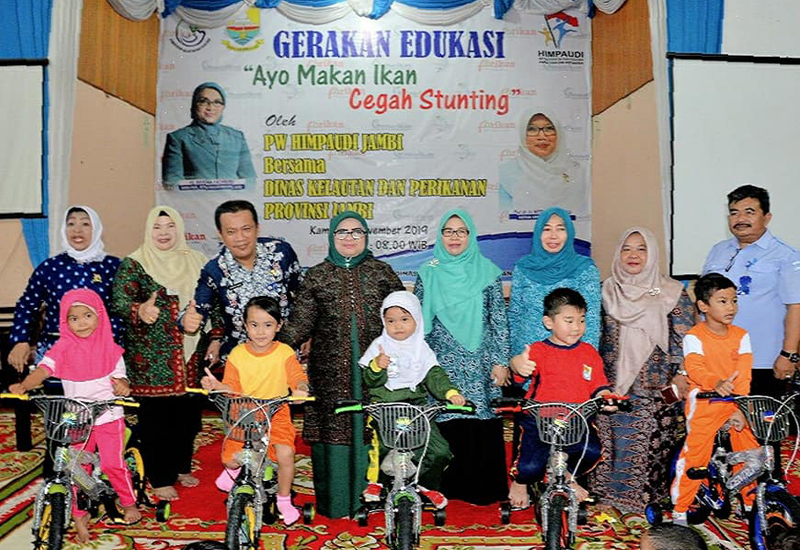 Jambi - Ketua Tim Penggerak Pemberdayaan dan Kesejahteraan Keluarga (TP PKK) Provinsi Jambi yang juga sebagai Bunda Pendidikan Anak Usia Dini (PAUD) Provinsi Jambi, Hj. Rahima menghadiri Gerakan Edukasi Makan Ikan Cegah Stunting oleh PW Himpaudi (Himpunan Pendidik dan Tenaga Kependidikan Anak Usia Dini Indonesia) bersama Dinas Kelautan dan Perikanan Provinsi Jambi, yang digelar di Aula Dinas Kelautan dan Perikanan Provinsi Jambi, Kamis (21/11).